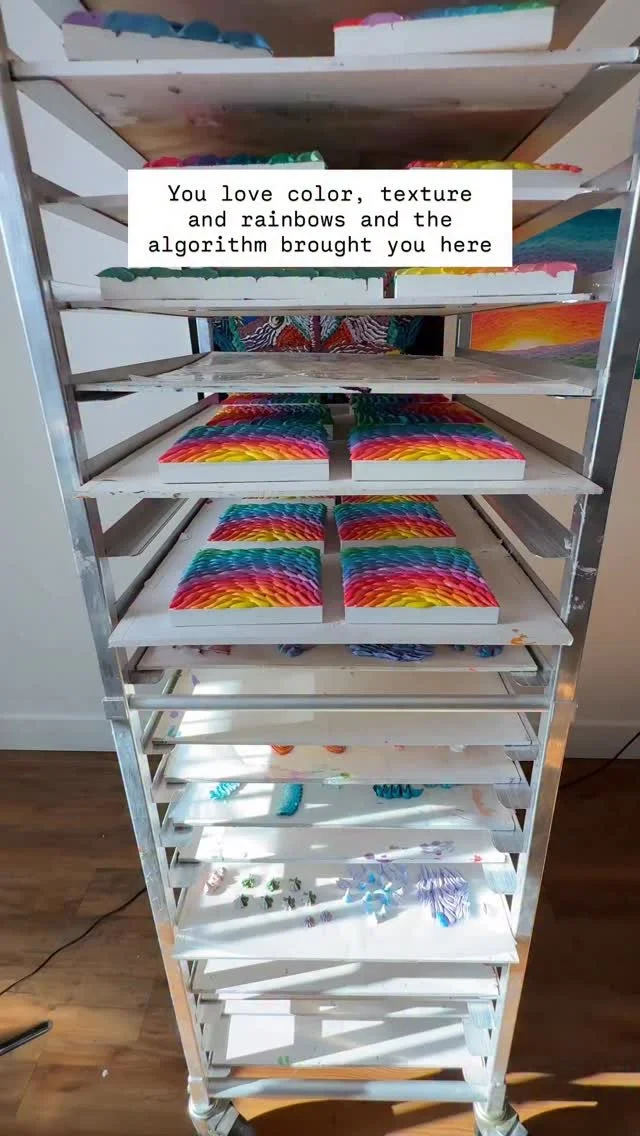I use all sorts of art mediums to explore color, like acrylic paint, watercolor, printmaking, resin, and sculpture. You may have seen my rainbows and thick acrylic textures on social media! Here on the website, you will find my original art for sale here during shop updates. I also teach art techniques for adventurous creatives AND coach savvy art business owners who are ready to sell their art!
